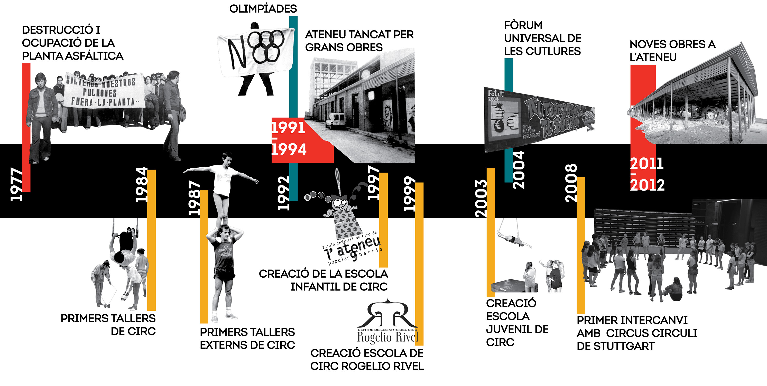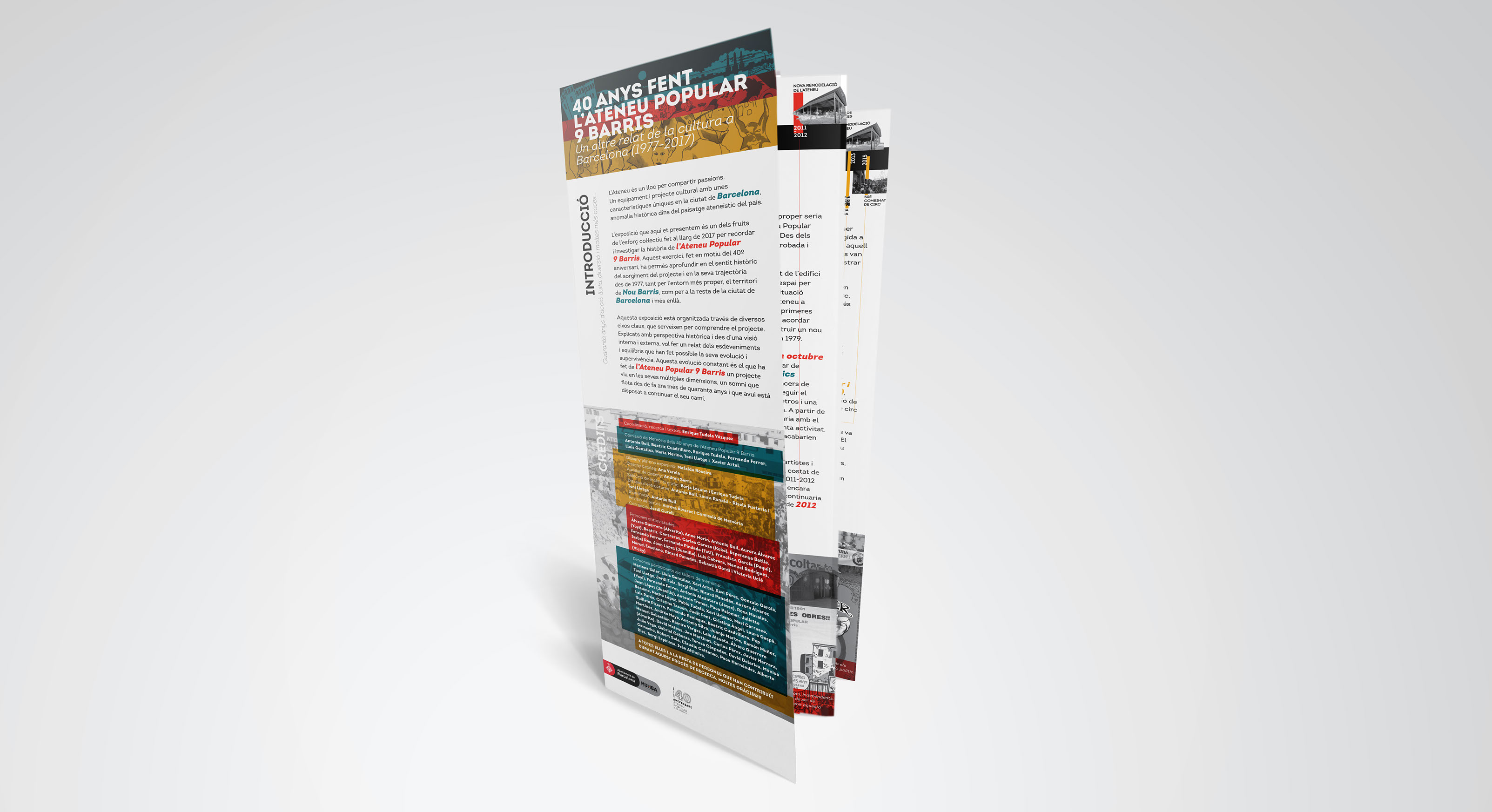 40 ANYS FENT L'ATENEU POPULAR 9 BARRIS - Exhibition - Directed and designed 16 panels 200x60cm narrating the history and collective memory of Ateneu Popular 9 Barris, for it’s 40th anniversary. Three colours were defined to categorize parallel fields: Barcelona, Ateneu and Circus. A time-line was created in order to chronologically represent its historical, political and artistic events. This project is sponsored by (Museo d’Historia de Barcelona).
